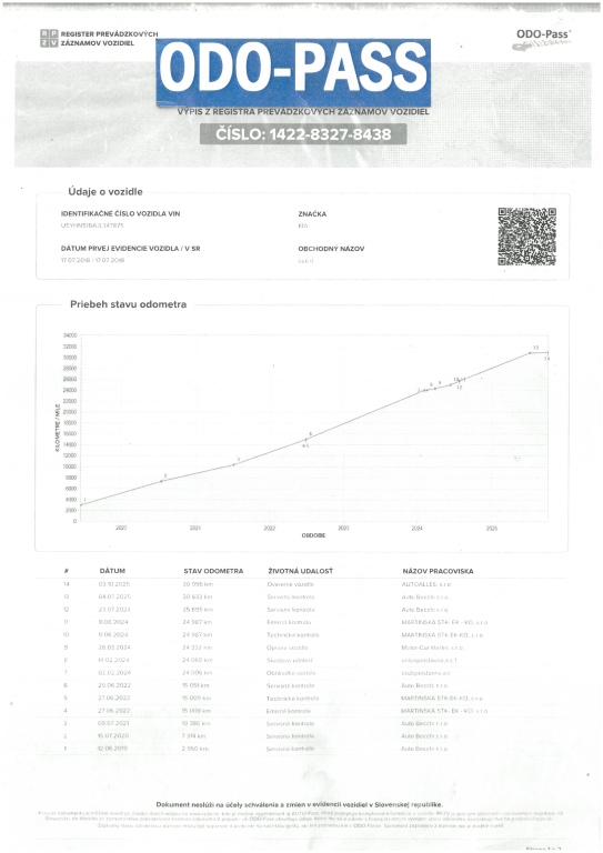 Vozidlo ako nové kupované v SR. Originálne najazdené kilometre si môžete overiť aj u ktoréhokoľvek oficiálneho predajcu KIA. Vozidlo je nehavarované. O vozidlo bolo starané, pravidelný servis. Posledná servisná prehliadka: 27.6.2025 pri 30 833 km. Auto je v TOP stave a jazdí bez akýchkoľvek problémov. Nápravy sú pevné, bez klepania. Interiér ako nový. Málo využívané. Ku vozidlu je vystavený výpis zo štátneho Registra prevádzkových záznamov vozidiel - ODO-PASS, ktorý zobrazuje históriu najazdených kilometrov vozidla! AUTOALLES: najväčší slovenský autobazár, už od roku 1990, doživotná záruka na pôvod vozidla s garanciou vrátenia peňazí. Tešíme sa na vašu návštevu.