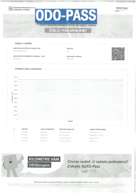 Vozidlo dovezené zo zahraničia / Dánsko. Skelet vozidla je nehavarovaný. Ku vozidlu je vystavený výpis zo štátneho Registra prevádzkových záznamov vozidiel - ODO-PASS, ktorý zobrazuje históriu najazdených kilometrov vozidla. Vozidlo v dobrom technickom aj optickom stave. Karoséria v dobrom stave, bez viditeľnej korózie, iba bežné známky používania. Interiér pekný čistý a nezničený, sedačky nevysedené a nepotrhané, po nefajčiarovi. Motor má kultivovaný chod. Pohon 4X4 funguje bez problémov, možnosť vyskúšať v teréne pri našom areáli. Automatická prevodovka radí bez problémov. Podvozok a nápravy v poriadku, pri jazde nič nebúcha ani nevibruje. Obuté zimné pneumatiky na hliníkových diskoch 215/55 R17. Ku vozidlu 2x kľúč + 2 x diaľkové ovládanie od centrálu, servisná kniha. Výmena rozvodového ústrojenstva: 2.8.2024 pri 162 848 km, 10/2025 namontovaná nová autobatéria. Vozidlo aktuálne bez ďalšej nutnej investície. VIN: KNEJE55185K057807. AUTOALLES: najväčší slovenský autobazár, už od roku 1990, doživotná záruka na pôvod vozidla s garanciou vrátenia peňazí. Tešíme sa na vašu návštevu.